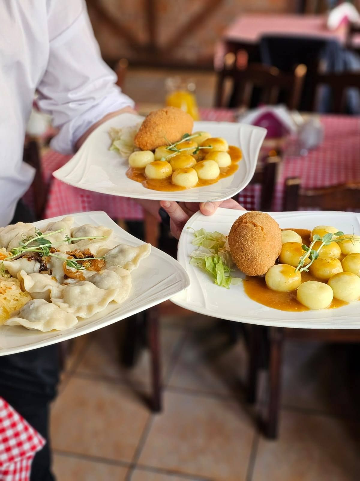 Serwujemy je w tradycyjnej formie z kwaśną śmietaną, cukrem lub sosem grzybowym, ale również w nowoczesnych odsłonach z dodatkiem wędzonego łososia, gulaszu czy warzywnych kompozycji.